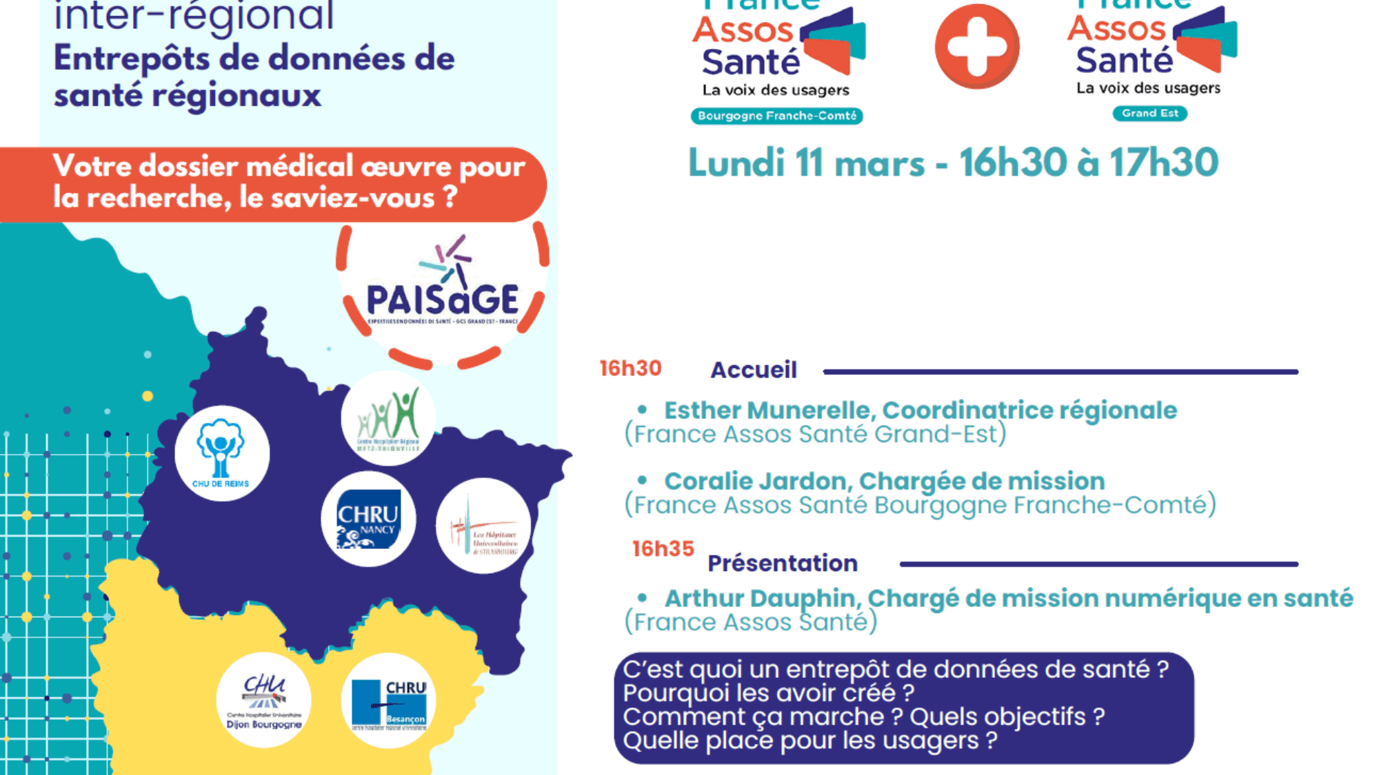 Les délégations Bourgogne Franche-Comté et Grand-Est de France Assos Santé ont ainsi proposé un temps d’information et d’échange dédié, lundi 11 mars en visioconférence. Arthur DAUPHIN, chargé de mission numérique en santé à France Assos Santé, a animé ce webinaire pour donner aux acteurs associatifs du réseau, et en particulier aux RU, des clés de compréhension sur ces nouvelles structures et les nouvelles missions associées (cf. Fiche Mission « représenter les usagers en entrepôt de données de santé »).