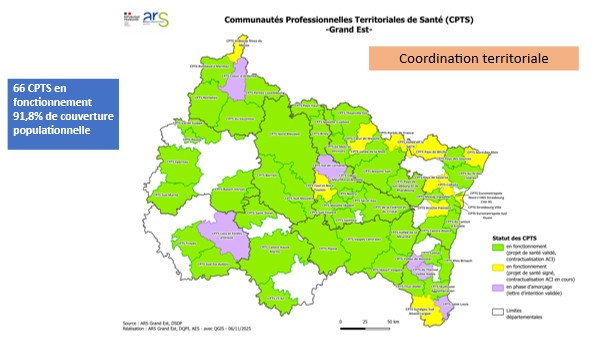 - Communautés Professionnelles Territoriales de Santé (CPTS) : 66 en fonctionnement, couvrant près de 92 % de la population.