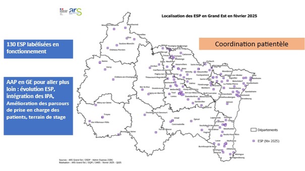 L’ARS Grand Est place la coordination entre les professionnels et les structures de santé comme élément central et en parallèle, la Stratégie Ma santé 2022 généralise l’exercice coordonné des professionnels.