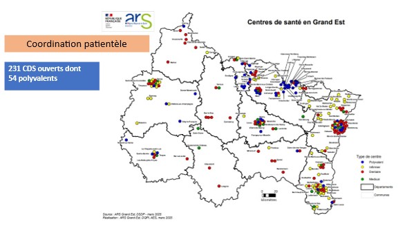 Les centres de santé sont des structures sanitaires de proximité, dispensant des soins de premier recours et, le cas échéant, de second recours et pratiquant à la fois des activités de prévention, de diagnostic et de soins, au sein du centre, sans hébergement, ou au domicile du patient. Ces structures favorisent la coordination des professionnels et la mise en œuvre de projets de santé adaptés aux besoins locaux. Actuellement 231 ont ouverts en Grand Est, dont 54 sont polyvalents.