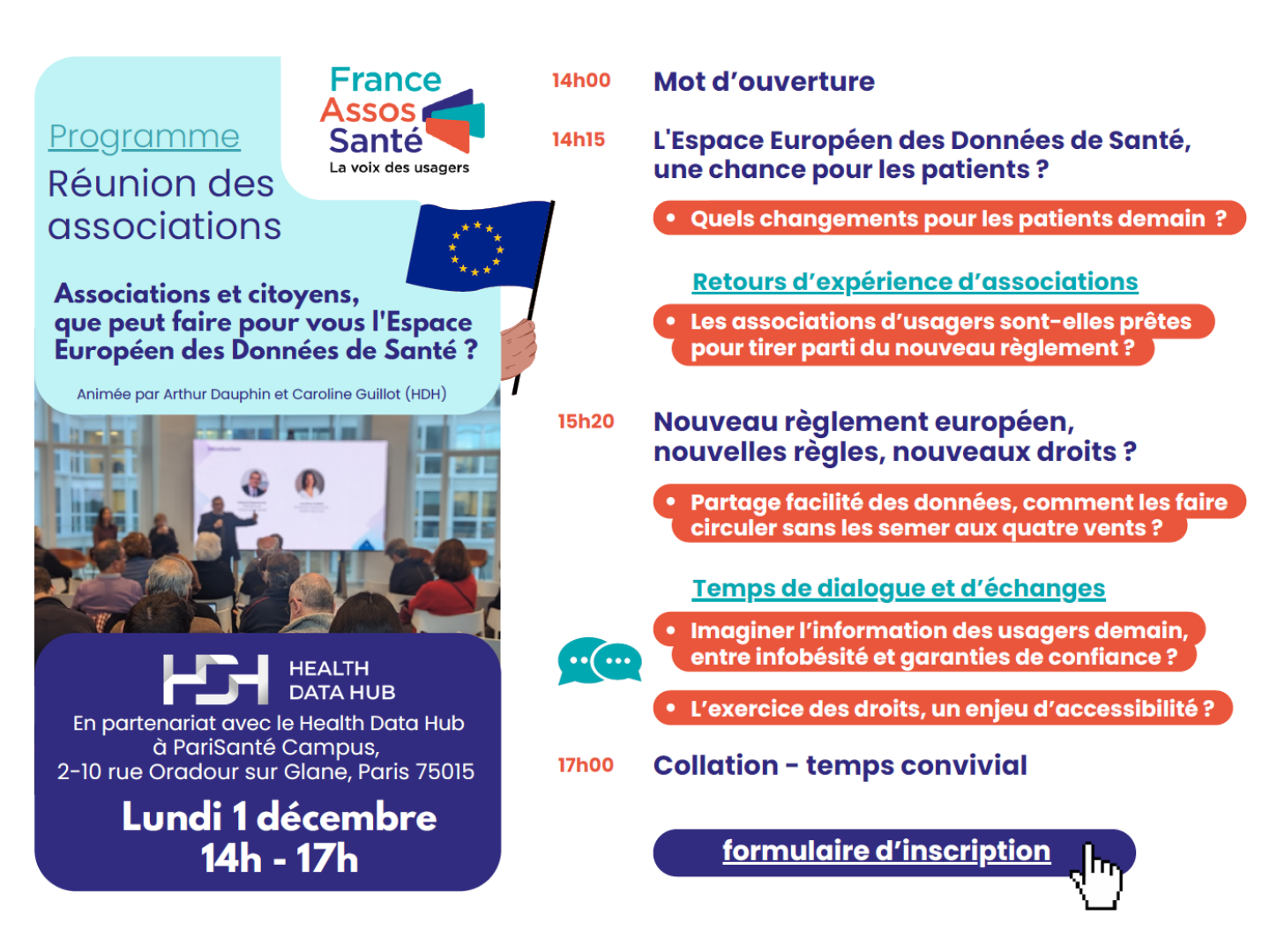 France Assos Santé, avec le soutien du Health Data Hub, vous invite le 1er décembre après-midi à une grande réunion associative à Paris : « Associations et citoyens, que peut faire pour vous l’Espace Européen des Données de Santé ? », un règlement européen qui va accélérer en France la dynamique des Entrepôts de données de santé !