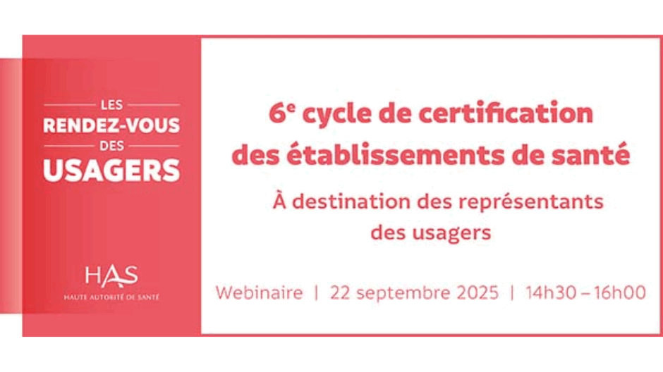 La Haute Autorité de santé et France Assos Santé vous invitent conjointement à un webinaire sur le 6e cycle de certification des établissements de santé. Dédié aux représentants des usagers dans les établissements de santé, il présentera les évolutions de la certification qui débute au second semestre 2025 ainsi que les outils et ressources proposés pour accompagner efficacement la participation des usagers.