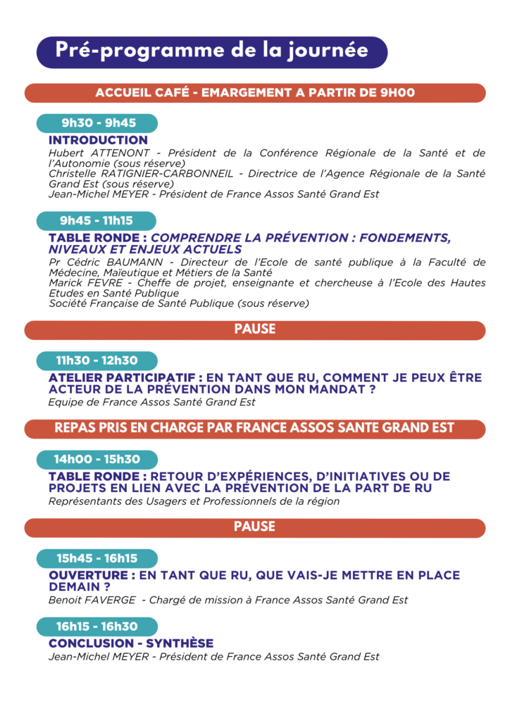 Cette journée sera l’occasion, pour nous, de vous rencontrer, d’échanger avec d’autres RU et acteurs de la démocratie en santé, de mieux comprendre les enjeux actuels de la prévention et de partager vos expériences et vos idées pour renforcer la place des usagers dans les actions de prévention.